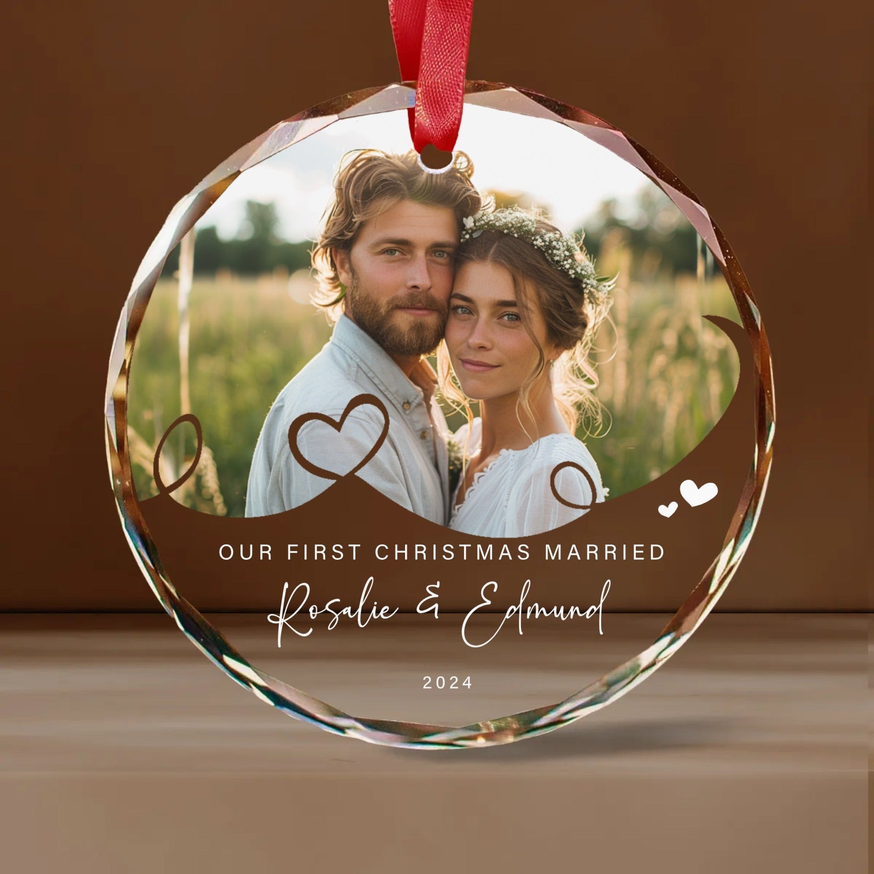 This custom glass ornament marks the first Christmas of a newly wedded couple. Personalize it with a photo and cherish the memories of your first holiday together. A perfect wedding gift that will add a special touch to any Christmas tree.